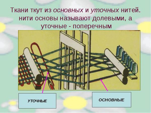 Для производства используют две нити – долевую и уточную. Первая является основной полотна, всегда идет параллельно кромке, а вторая идет перпендикулярно.