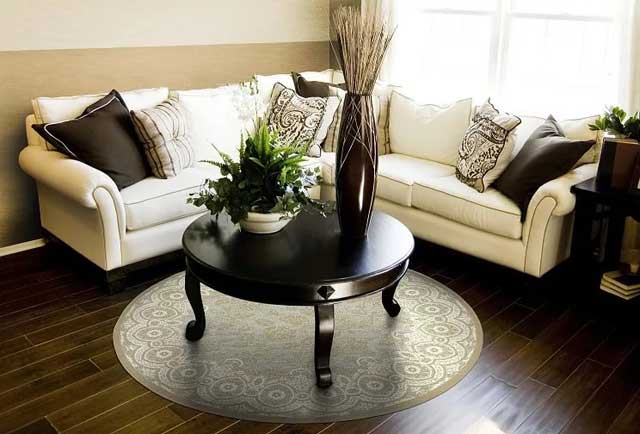 - Круглую. Изделия великолепно смотрятся во всех комнатах. Их часто кладут в детских и спальнях. Бывают индивидуальные и стандартные параметры. Не рекомендуется стелить в небольших длинных комнатах. Такой вид модели визуально будет уменьшать пространство. Отлично ковровые покрытия выглядят в помещениях большой площади. Располагают посередине. Дополняют журнальным столиком.