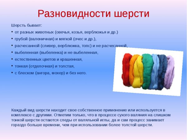 Шерсть для валяния берется только животного происхождения. Искусственный материал не дает нужных результатов из-за различий в строении волокон. Но даже натуральная шерсть имеет существенные различия между подвидами и каждый отдельный вид может применяться далеко не для каждой поделки.